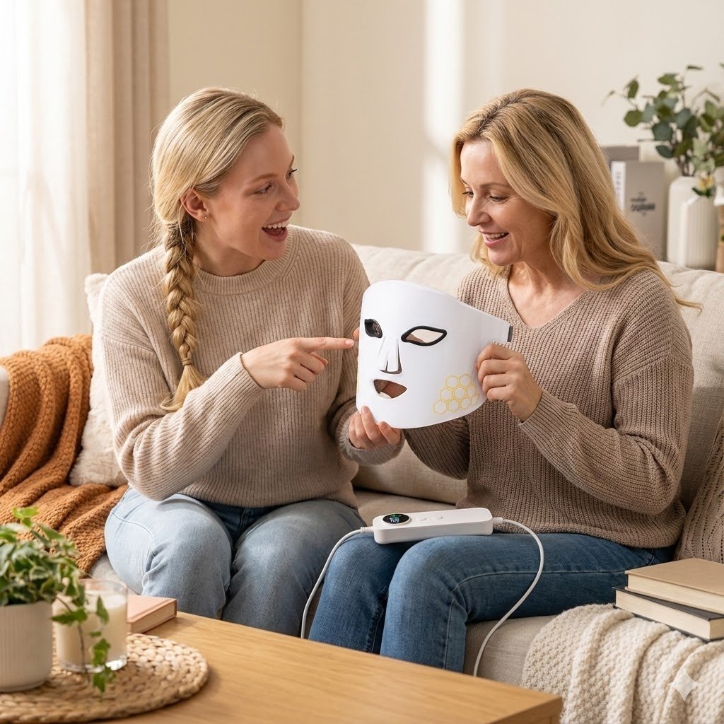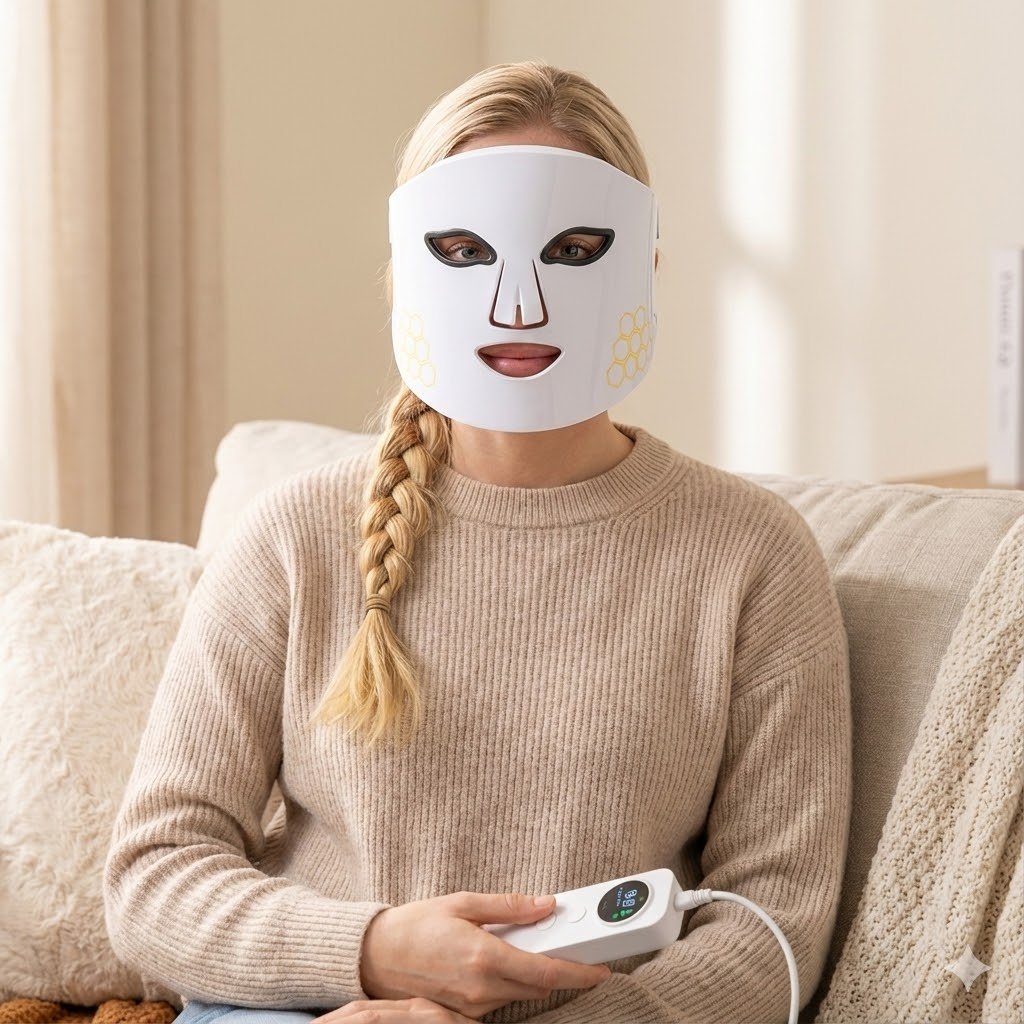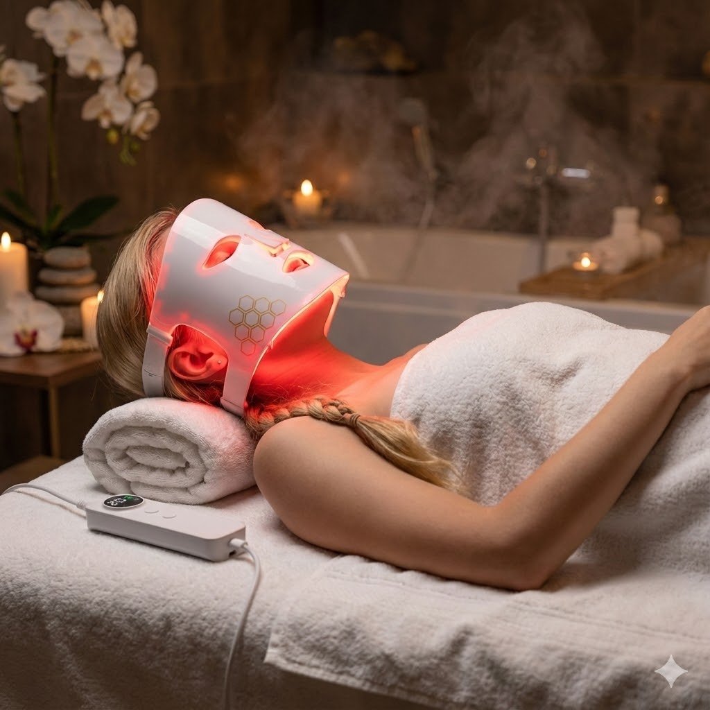 Turn any moment into a spa experience. The 360° Contoured Fit gently hugs your face, ensuring optimal light absorption even on the jawline. Perfect for unwinding on the sofa after a long day.